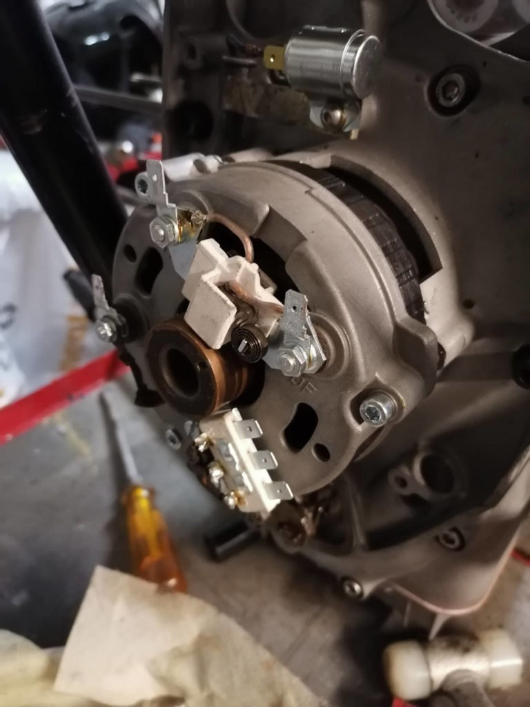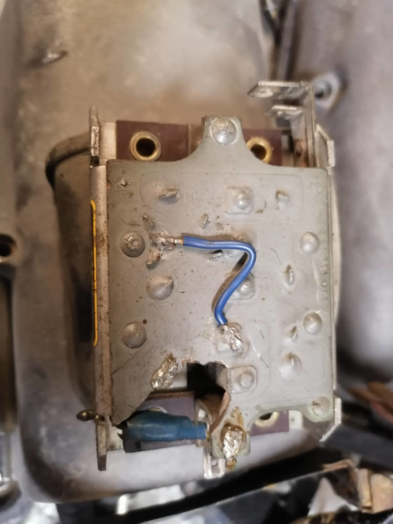 Je vous avais dit que cette moto avait été bricollée par un maréchal ferrant,il a même dû utiliser la pince à ferrer les ânes pour demonter le bloc de diodes, je l’ai microbillé, réparé et piqué un pot de rouge à ongles à ma femme….