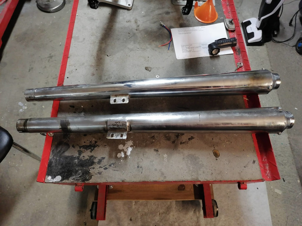 Les flutes Vattier qui étaient montées, mais bonjour le vacarme, j’ai essayé de mettre de la paille de fer dedans mais ça n’atténue pas assez et je n’aime pas le bruit inutile, donc achat de pots d’origines, et là c’est bien pour mes oreilles et celles des passants.